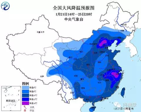 中央氣象臺1月21日10時(shí)發(fā)布未來四天的寒潮藍(lán)色預(yù)警: