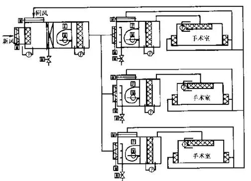 對一般醫(yī)院來講,使用專用機組分別處理新風,在增設新風風機后新風的處理質量同樣可以提高,并可緩解循環(huán)風機小風量、大風壓匹配的矛盾,系統(tǒng)運行控制也比較簡單。